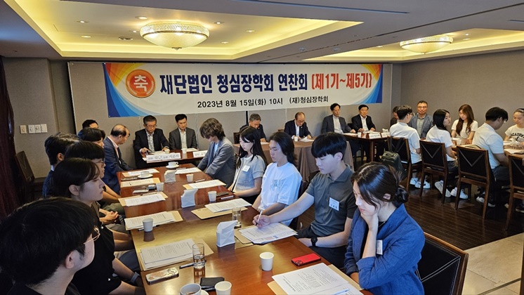 지난 8월 15일 제 1회 청심장학생 연찬회에는 청심장학회 심상조 이사장, 심대평 전임 이사장, 심오택 장학위원장을 비롯하여 이사, 운영위원 및 장학생 등 38명이 참석했다.