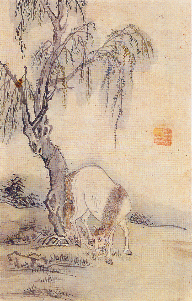 버드나무 아래 한 마리의 말이 매여있는 그림은 『고씨화보』에 실린 있는 당대(唐代) 명화가였던 한간(韓幹, 701-761)이 그린 <유하계마>가 유명하다. 현재가 그린 말은 땅에 얼굴을 대고 풀을 뜯고 있는 모습이다. 한간의 검은 말과 비교해 볼 때 현재의 말은 몸집도 작고 힘도 약해 보인다. 아마 현재가 우리에게 친숙한 제주도 조랑말을 그린 것이 아닐까 생각된다.